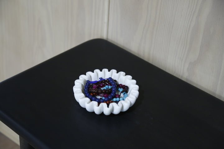 Elevate your space with this stunning hand-carved marble bowl, crafted from genuine marble with elegant fluted edges. Perfect for organizing coins, keys, and jewelry, or displaying candles for ambient lighting. Each piece is uniquely carved, making it a functional work of art that adds sophistication to any room—bedroom, bathroom, entryway, or living space. A versatile accent that combines beauty with everyday utility.
